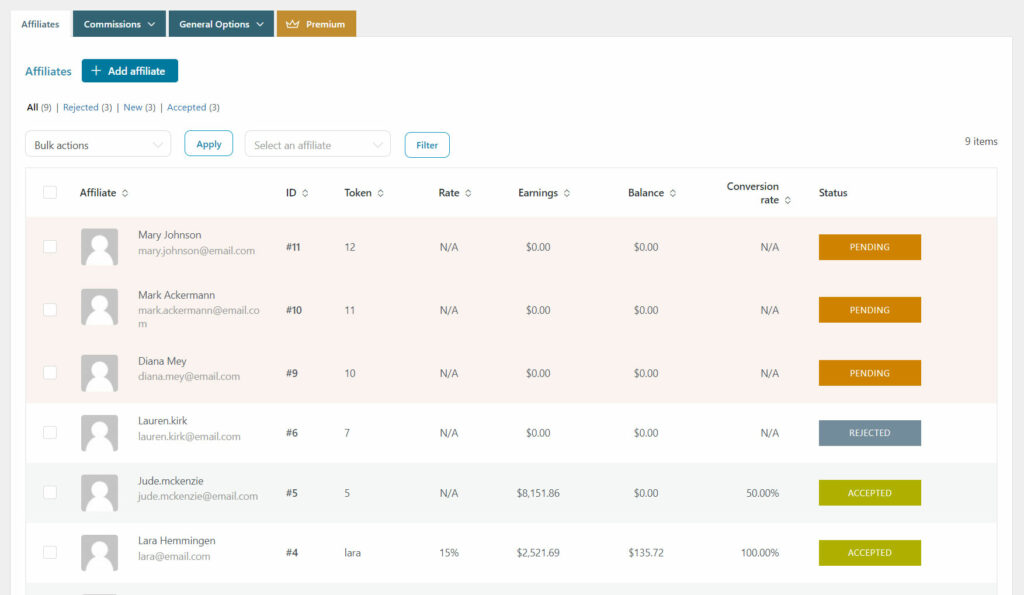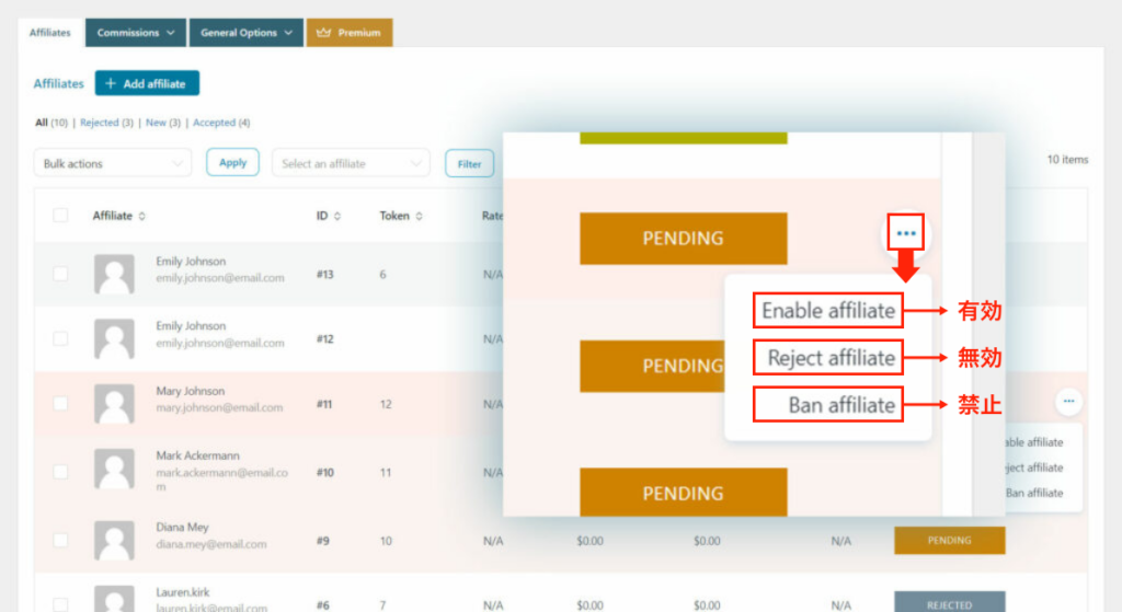 さらに、一括アクションまたは単一アフィリエイトのアクションからアフィリエイトステータスを変更することもできます。