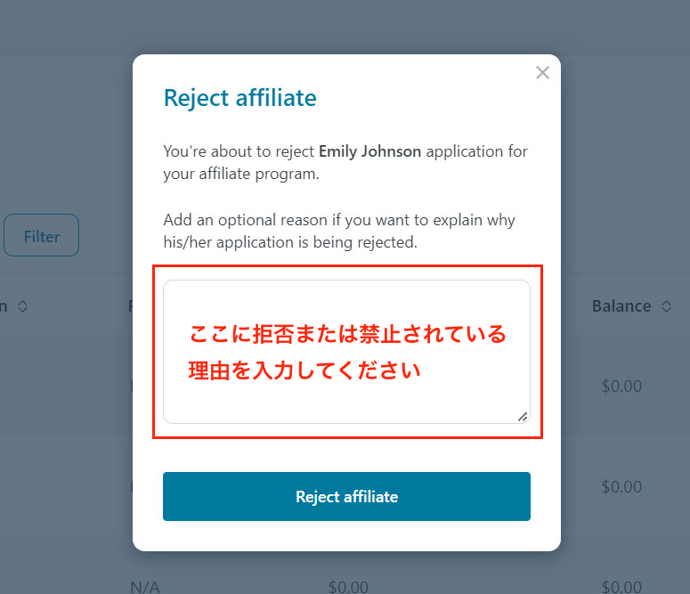 アフィリエイトのステータスをアフィリエイトのアクションから拒否または禁止に変更すると、専用のポップアップからこの特定のアフィリエイトに対するカスタムメッセージを設定し、アフィリエイトのプロフィールが拒否または禁止されている理由を入力できるようになります。