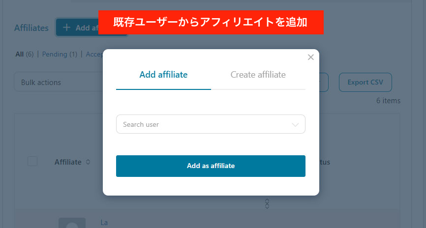 [+Add Affiliate]ボタンをクリックすると、新しいアフィリエイトを作成できます。既存のユーザーを選択するか、新しいユーザーを作成することができます。