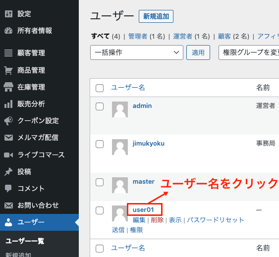 ユーザーのアフィリエイト情報を編集するには、「ユーザー」ページからユーザー名をクリックしてユーザー編集画面を開きます。