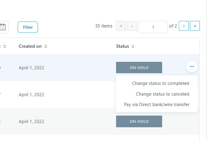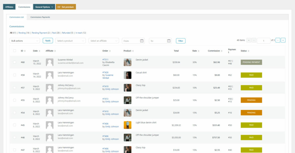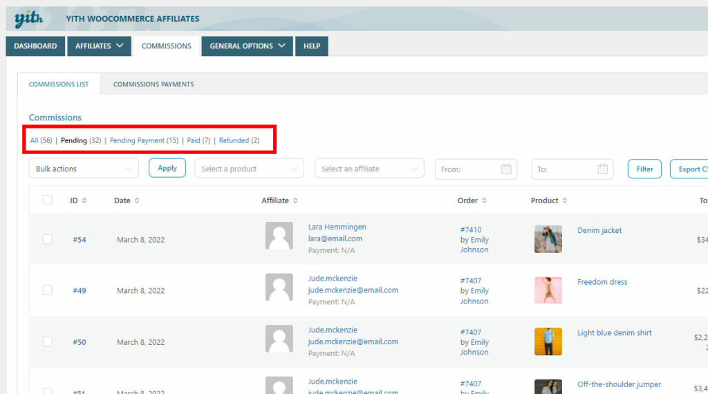 コミッションのステータスに基づいて、上部のフィルターを使用してコミッションのビューをフィルターしたり、保留中のコミッションまたは支払い済みのコミッションのみでフィルターしたりすることができます。