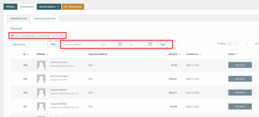 この画面から、ステータス、アフィリエイト、日付別に支払いをフィルタリングすることもできます。