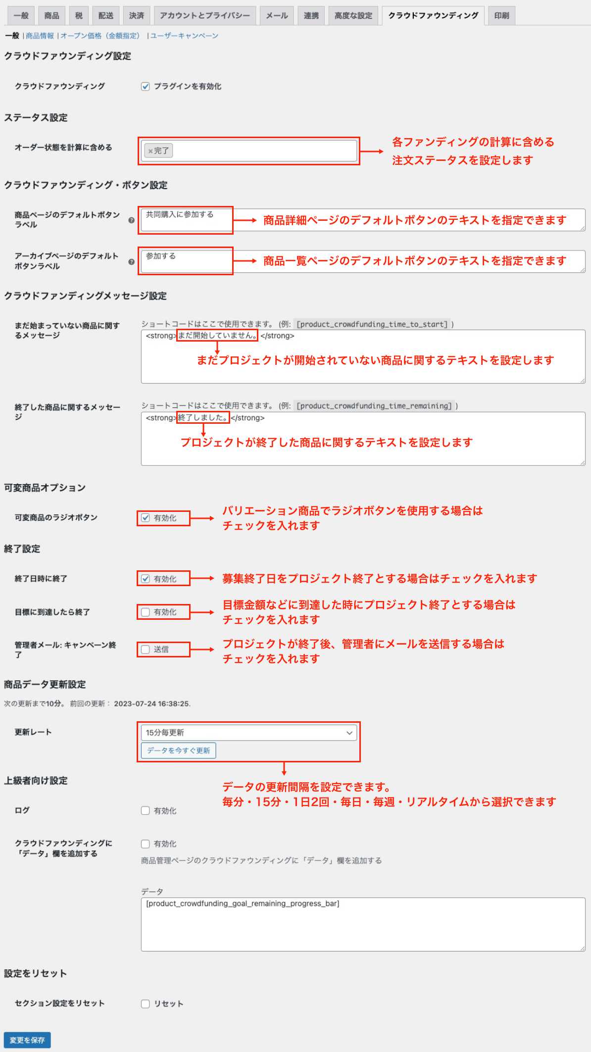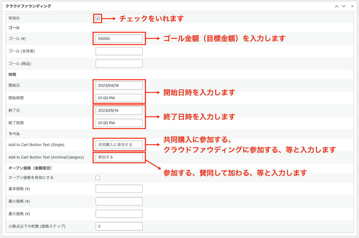 登録されている商品のクラウドファウンディングの設定画面に必要事項を入力します。