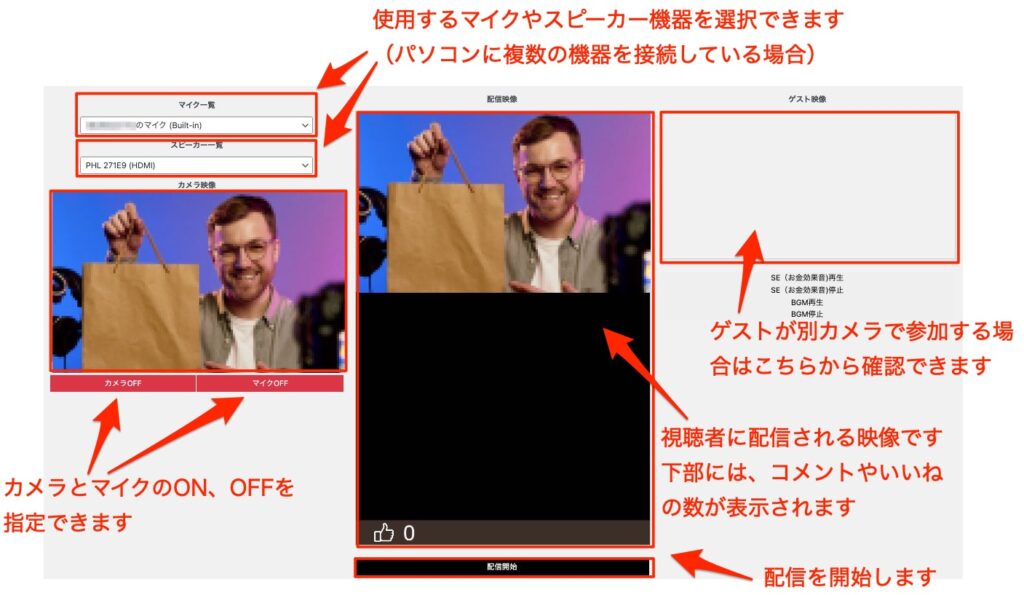 マイク、スピーカー、カメラの設定や、配信される映像を確認できます。