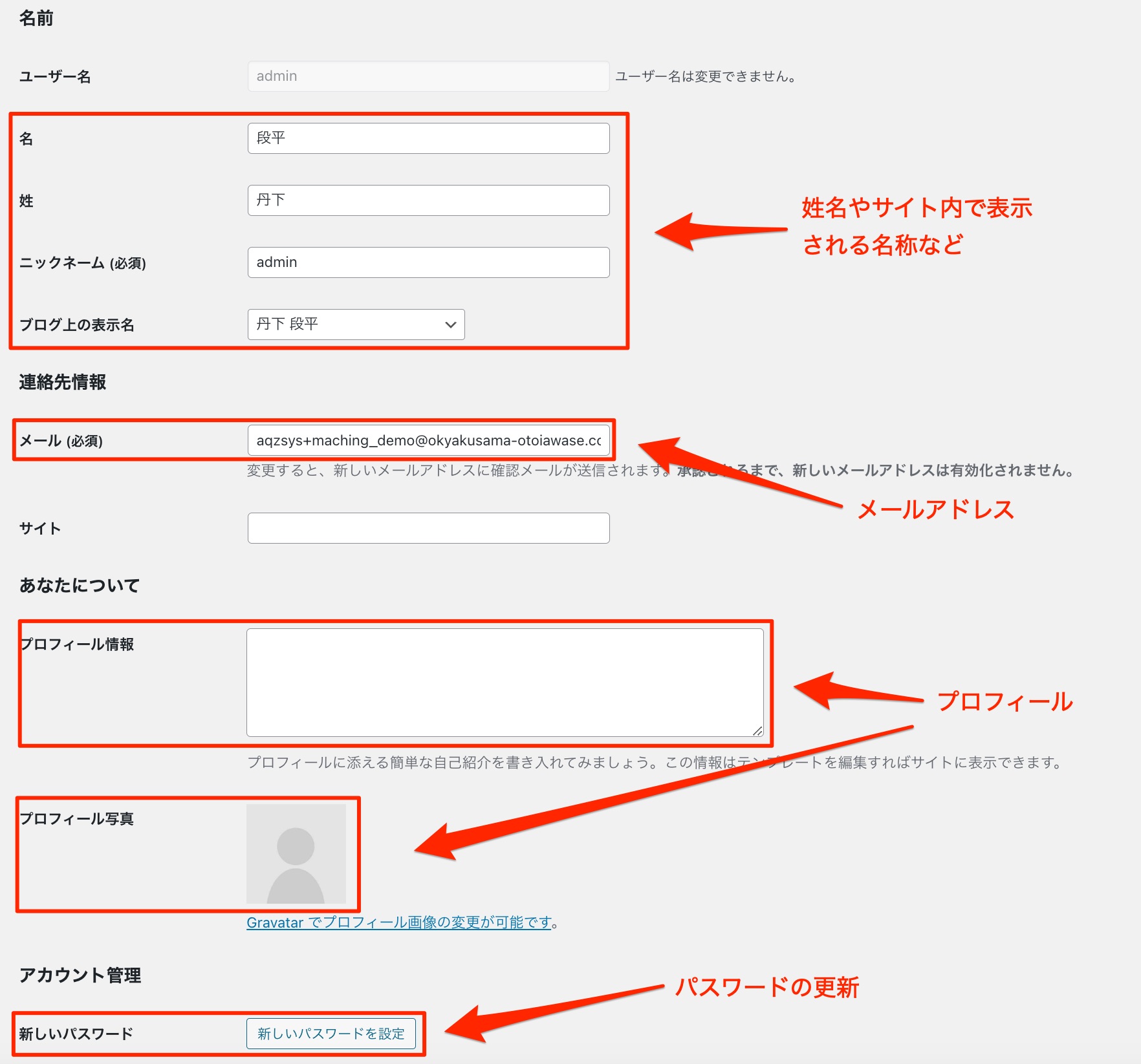 会員及び運営者のアカウント情報を管理する機能です。ユーザーの追加や削除、情報の編集が行えます。ユーザーごとにメールアドレスやパスワード、表示名などのプロフィール情報も設定できます。