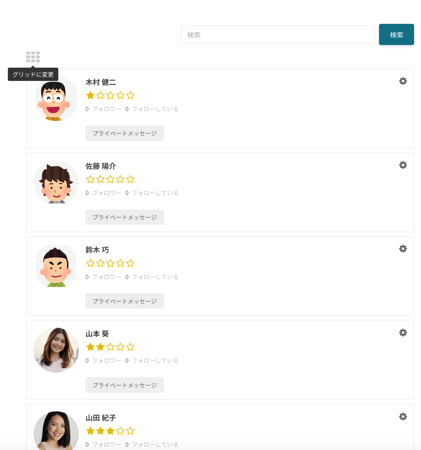 このページで、キーワードによる会員検索がができ、一覧表示はグリッド表示とリスト表示を切り替えることができます。